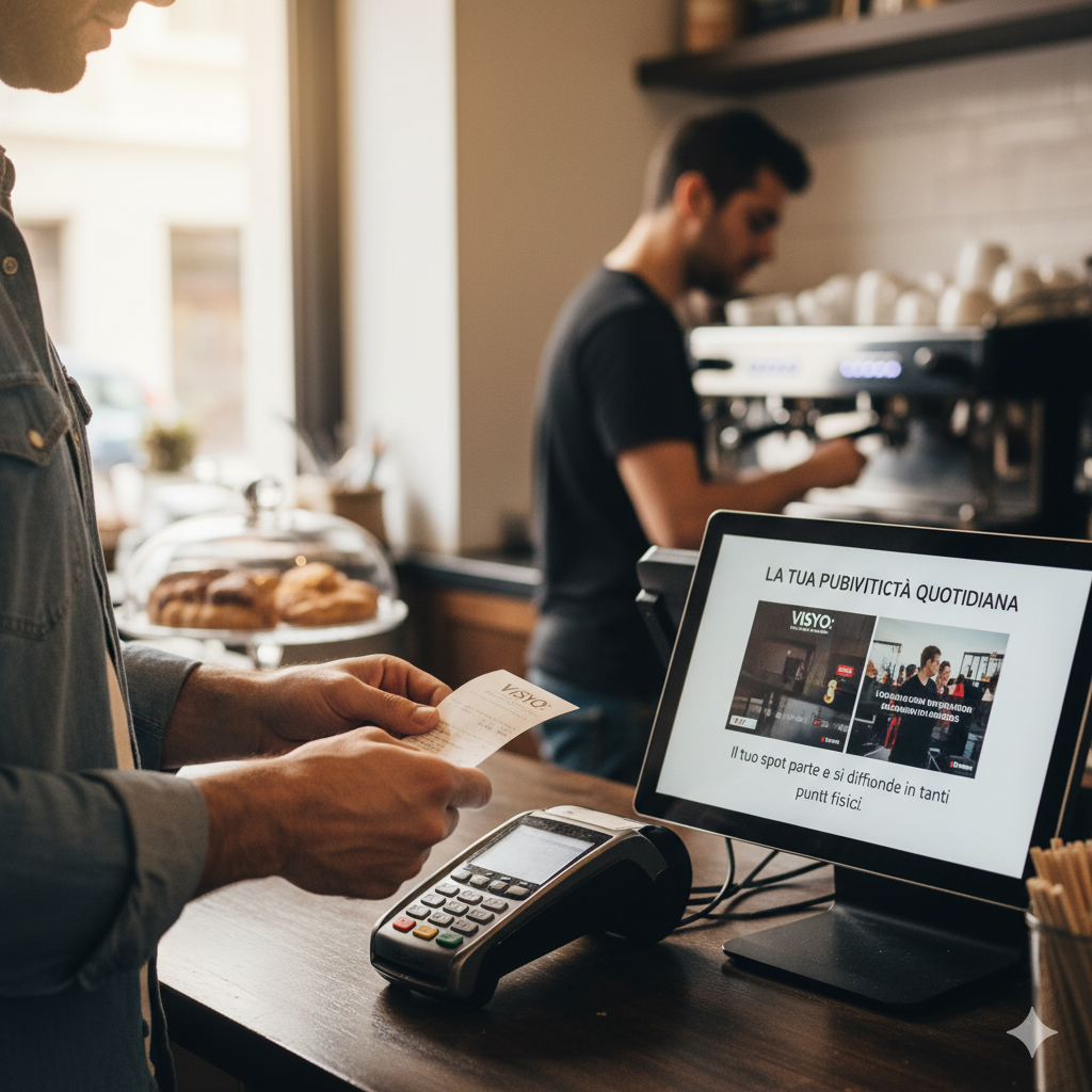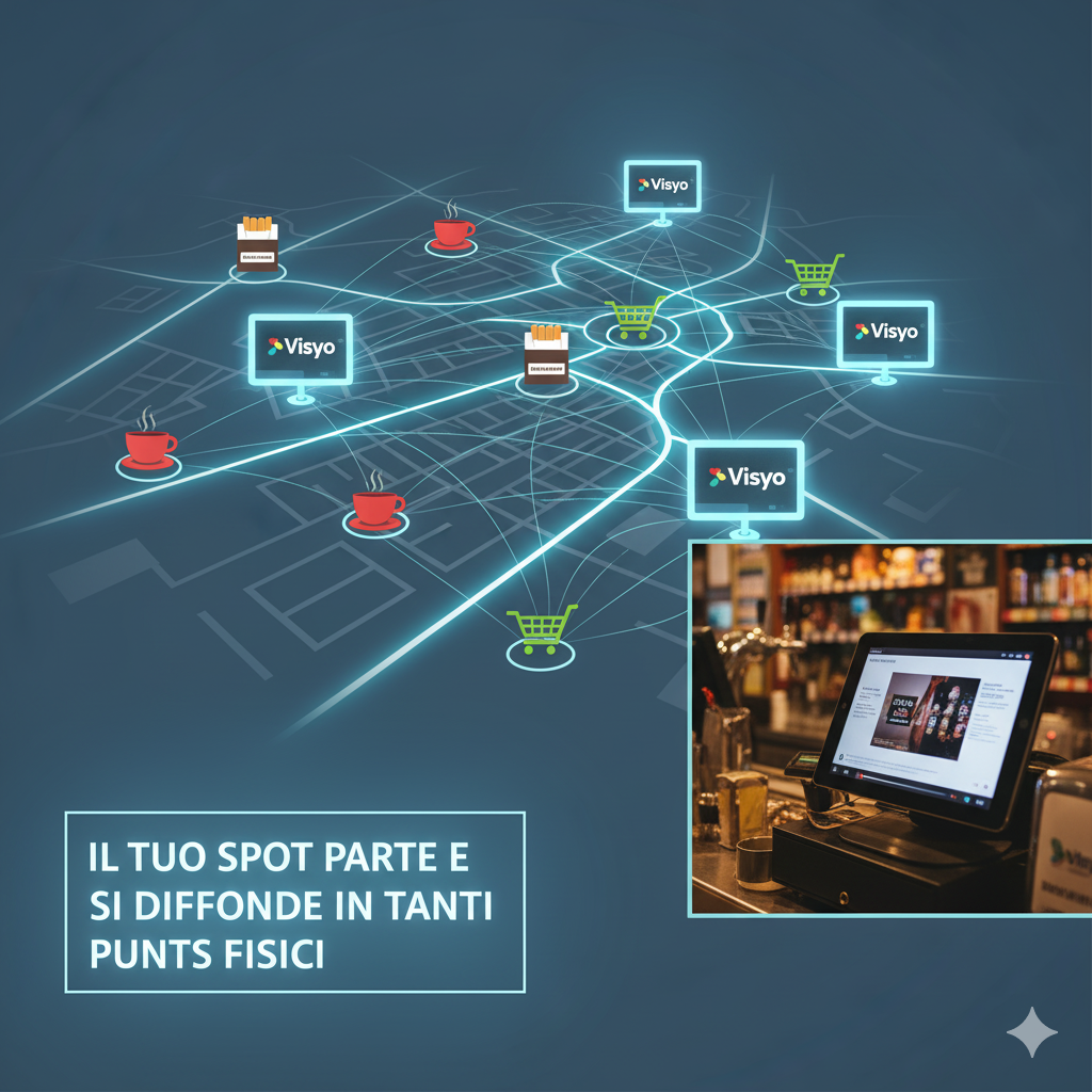 Benvenuto su Visyo, la tua soluzione per la pubblicità locale di successo. Trasmettiamo spot promozionali su schermi digitali in bar, tabaccherie e supermercati, offrendo visibilità e impatto per le attività locali.